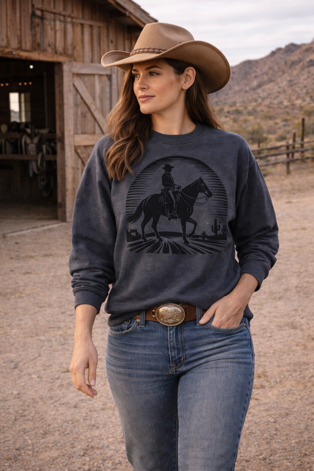 A quietly rugged crewneck that feels like an evening ride across wide, open plains. The soft midweight fleece settles warm against the skin while a dropped-shoulder cut and classic fit keep movement easy — like tossing a trusted layer over your shirt before heading out. The graphic — a solitary rider silhouetted against a textured sky — is subtly worn and artful, the kind of image that starts conversations without shouting. Wear it to the barn, on slow coffee mornings, or layered for campfire nights when you want comfort that reads handcrafted and honest.